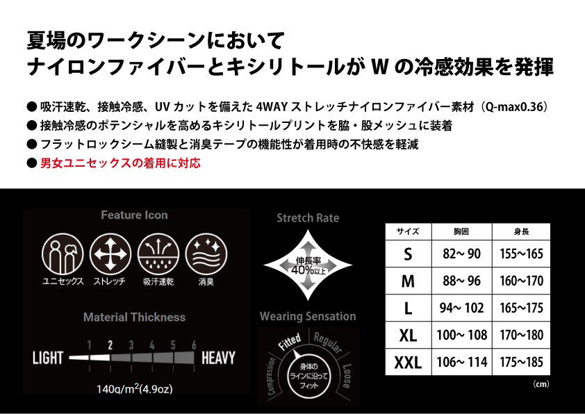 | 材質 | 表地 : ナイロン 80% . ポリウレタン20% メッシュ : ポリエステル 85% . ポリウレタン15% |